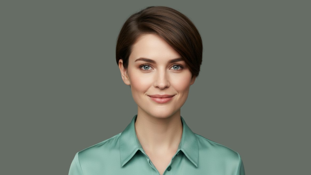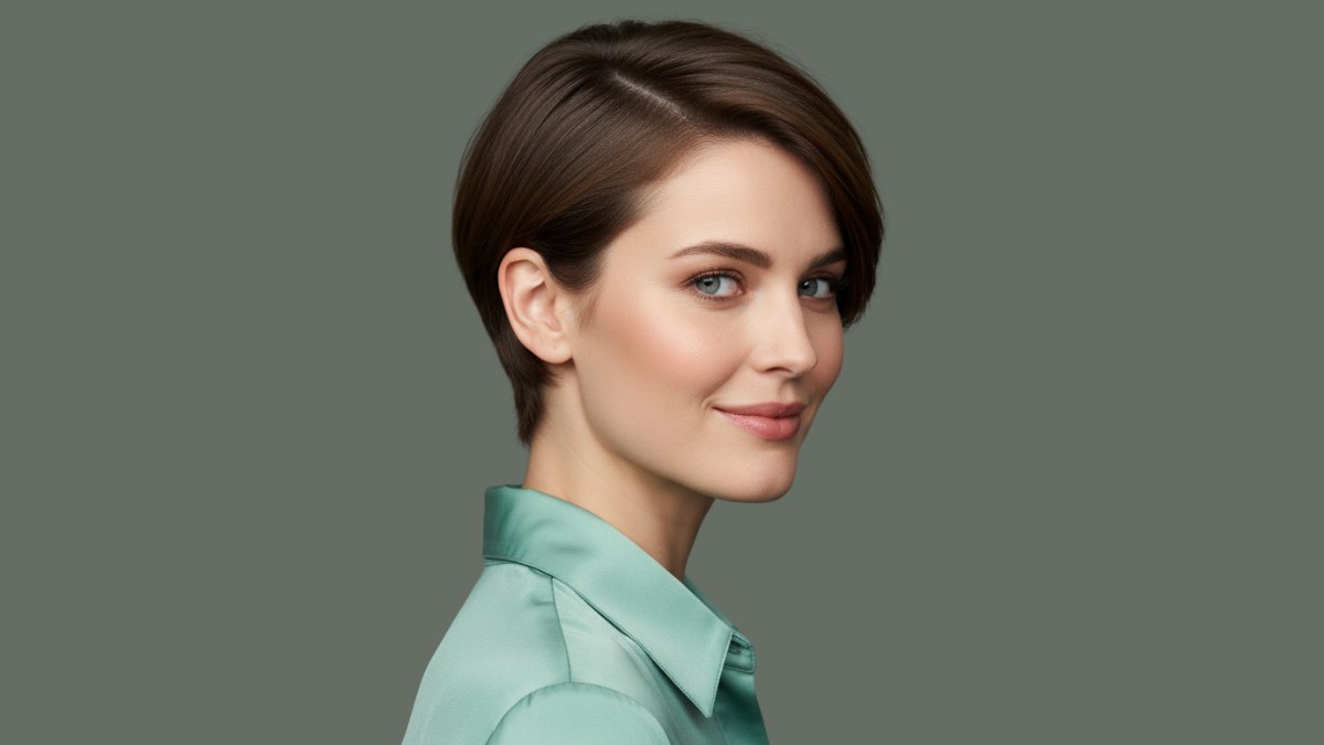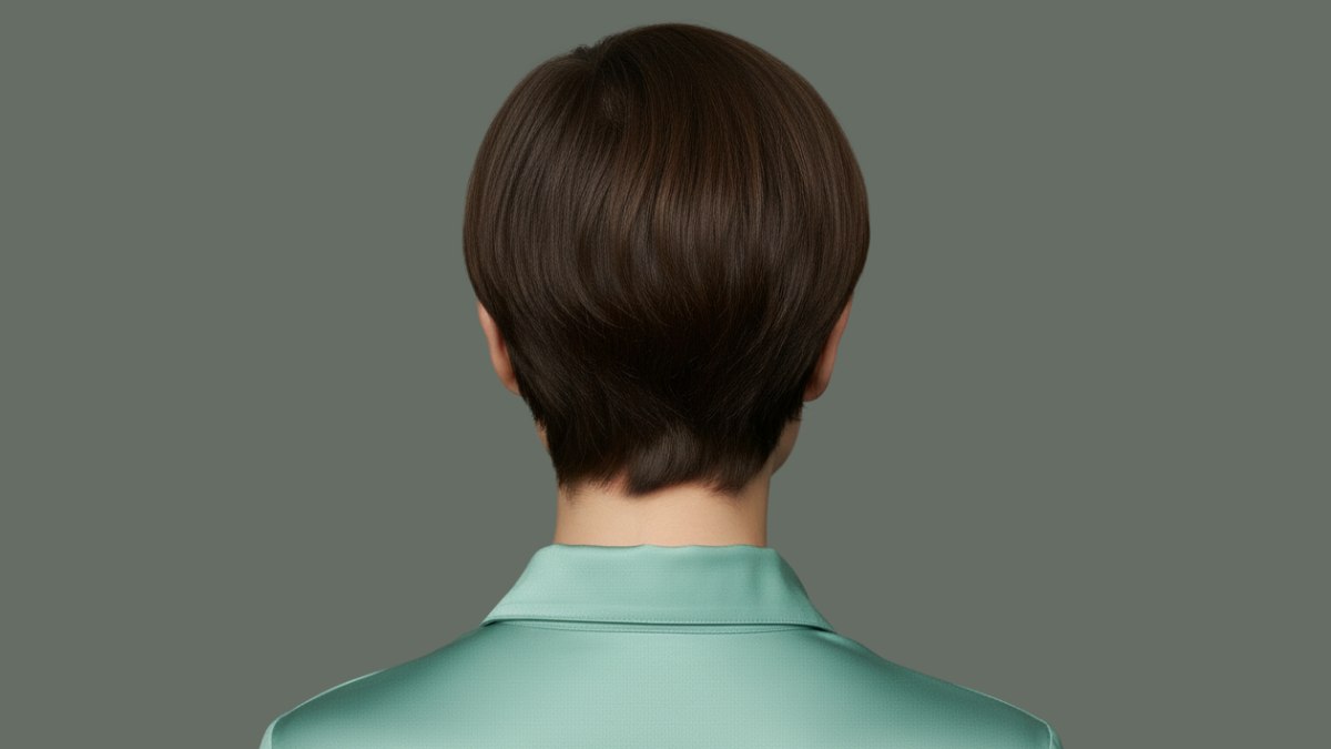 De haarkleur is bruin, bijna donker chocoladebruin, met subtiele dieptevariaties. Deze monochrome benadering werkt goed bij de strakke lijnen van de coupe, omdat het de vorm en structuur benadrukt zonder afleiding. De gladde, glanzende finish suggereert gezond, goed verzorgd haar dat het licht prachtig vangt.