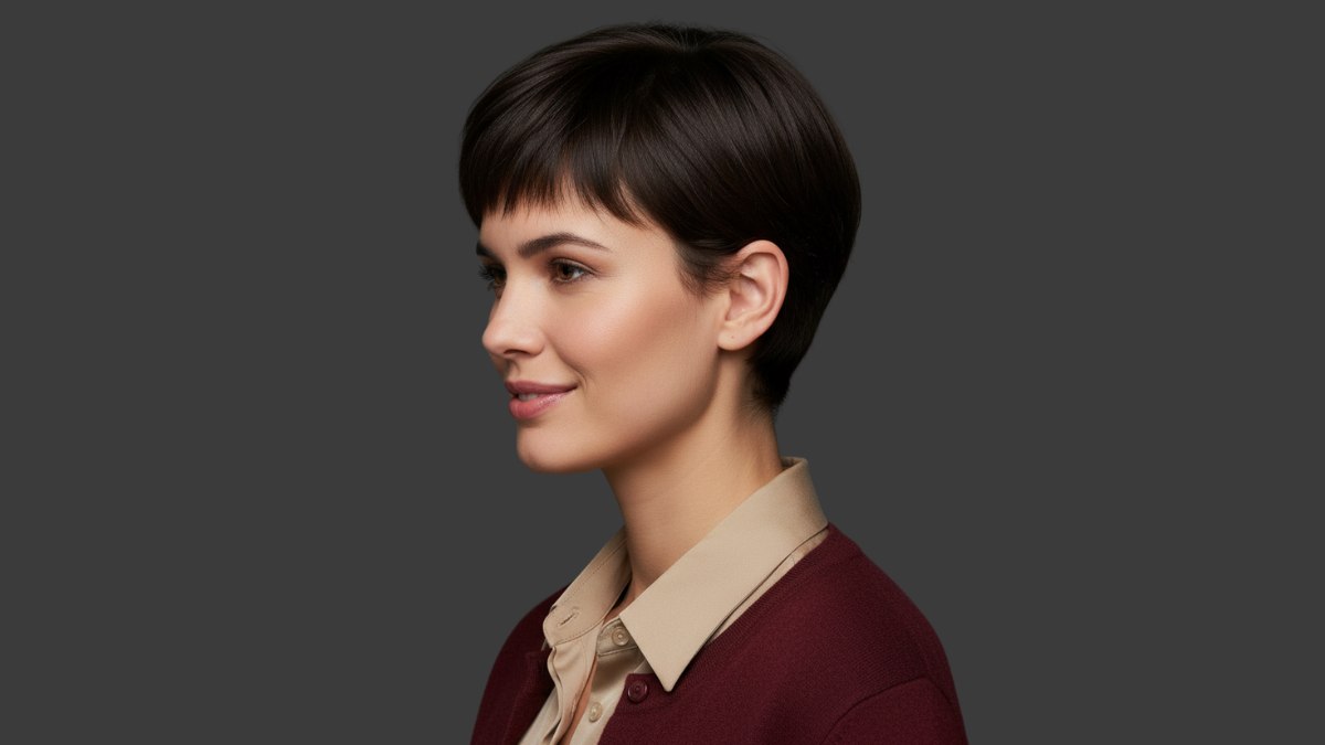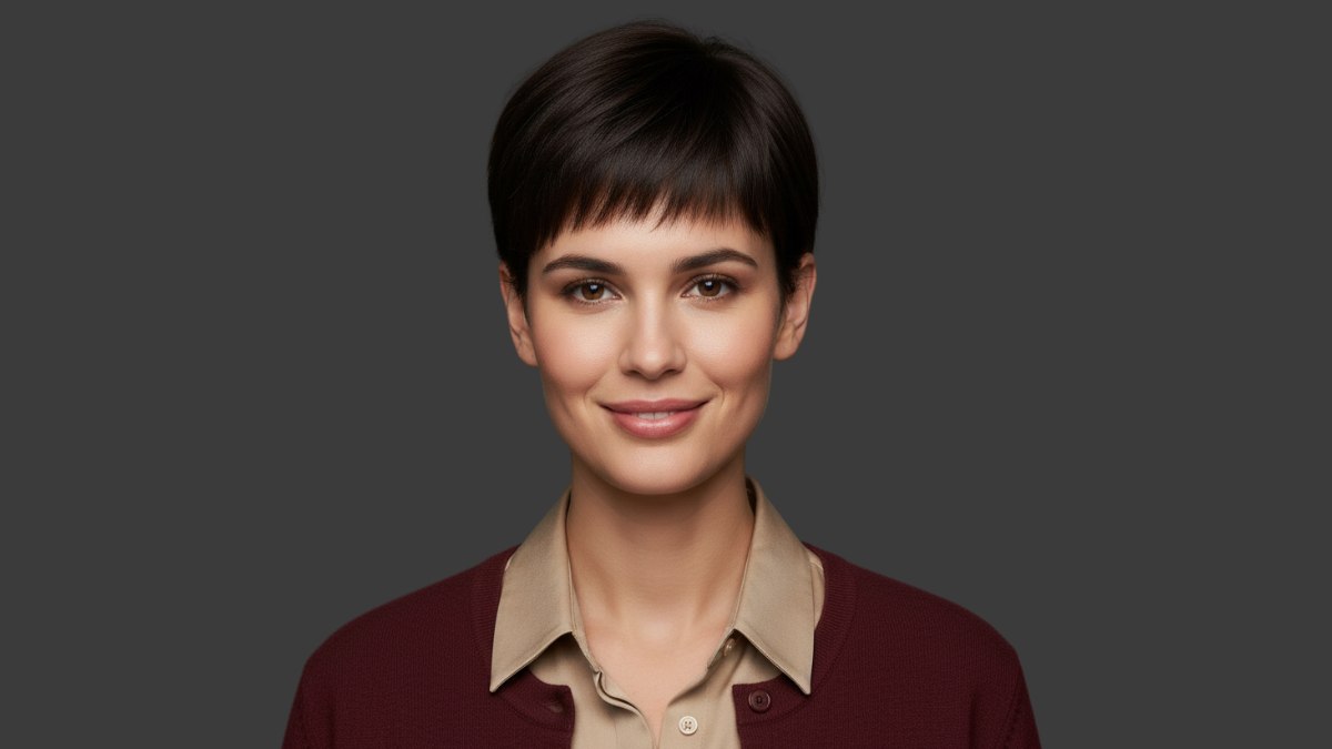 De kledingkeuze werkt uitstekend bij dit gedurfde kapsel. De combinatie van een beige hemd onder een bordeaux vest creëert diepte zonder de sterke lijnen van het kapsel te overheersen. Het hemd geeft een preppy element dat goed past bij de precisie van de pixie, en het warme bordeaux complimenteert de bruintinten in het haar. Deze outfit sluit perfect aan bij de moderne elegantie van de coupe.