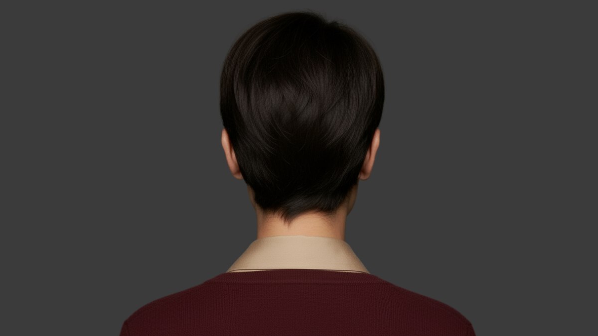 De styling is licht warrig bovenop, terwijl de zijkanten strak en beheerst blijven. Er zit een zachte textuur bij de kruin, zodat de look niet te streng wordt, terwijl de micro pony vlak en glad is gestyled voor een opvallende horizontale lijn. De korte lengte rond oren en nek zorgt voor een schoon silhouet dat de nek en gelaatstrekken mooi benadrukt.