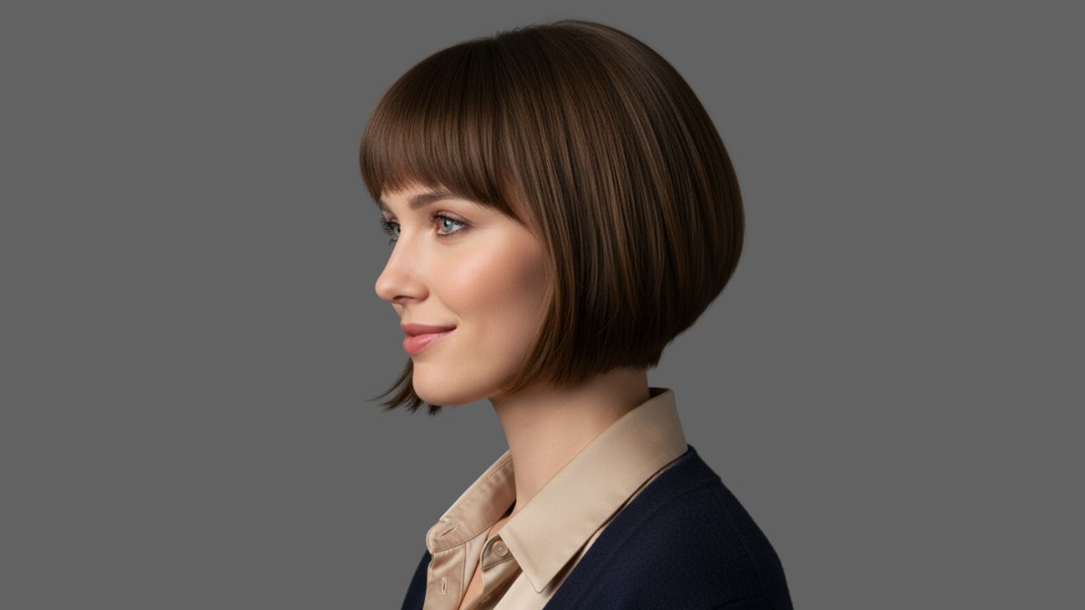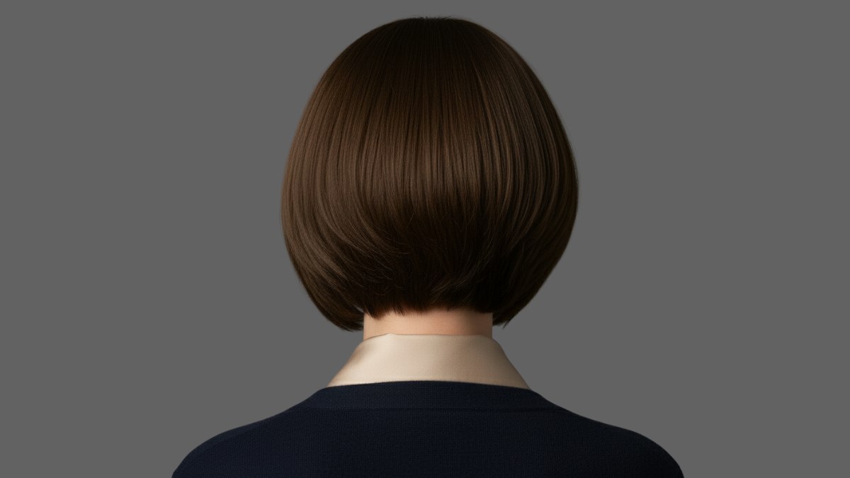Deze bob toont precisiewerk op zijn best. De coupe heeft een gradatie, korter aan de achterkant en geleidelijk langer naar voren toe, waardoor de klassieke concave vorm ontstaat die al decennia geliefd is.