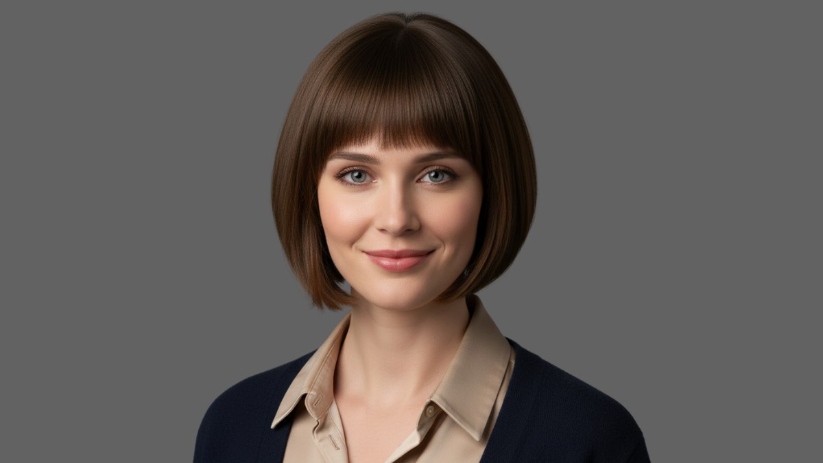 De styling is strak en glad, met haar dat steil en soepel valt terwijl het toch natuurlijke body en beweging behoudt. De zachte inwaartse curve aan de punten zorgt voor een verfijnde, subtiele finish. De pony ligt perfect vlak en netjes, wat de precisie van de coupe benadrukt.