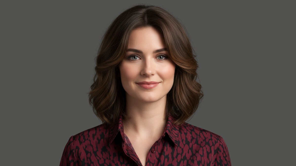 De bordeauxrode blouse met subtiele geometrische print vormt een mooie basis voor dit halflange kapsel. De diepe, rijke kleur creëert een mooi contrast met de lichtere highlights in het haar, terwijl de print van de blouse de zachte, vrouwelijke golven in het haar niet overheerst. De kraag en de gestructureerde vorm van de blouse balanceren de losse, romantische stijl van het haar.