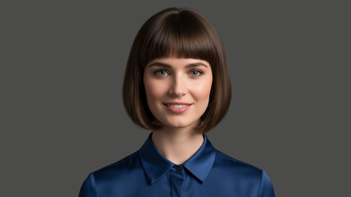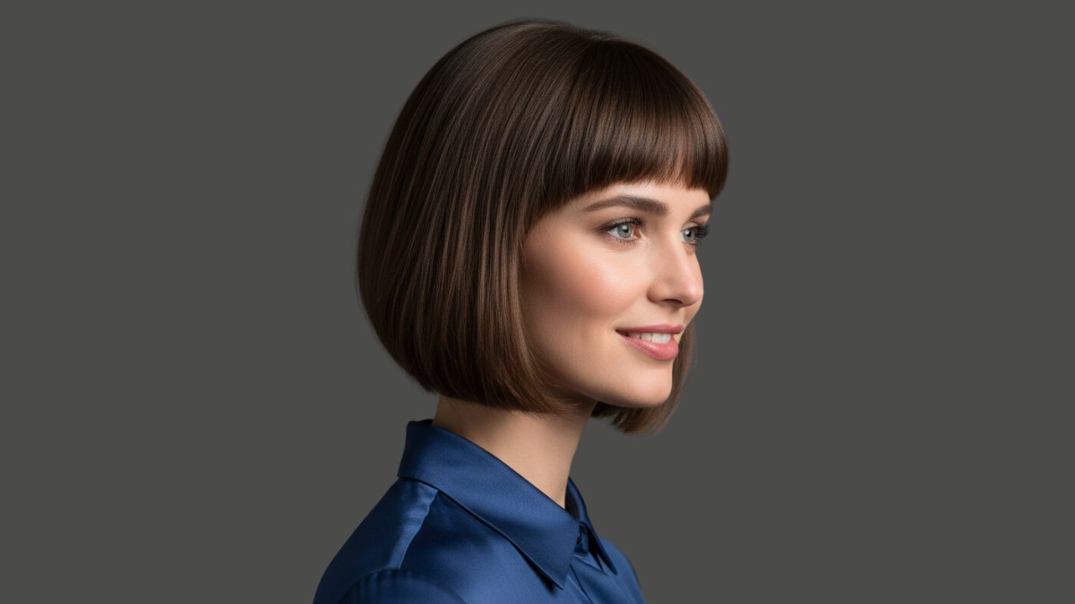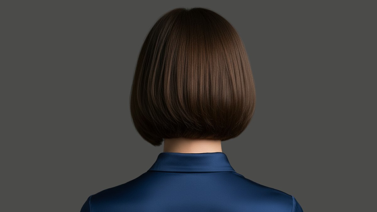 De haarkleur is chocoladebruin met subtiele diepteverschillen die het licht opvangen. Er zit een natuurlijke glans in het haar die wijst op uitstekende gezondheid en goede verzorging. De haarlokken ogen dik, waardoor de bob volume en beweging krijgt zonder pluizigheid of losse haartjes die de strakke lijn verstoren.