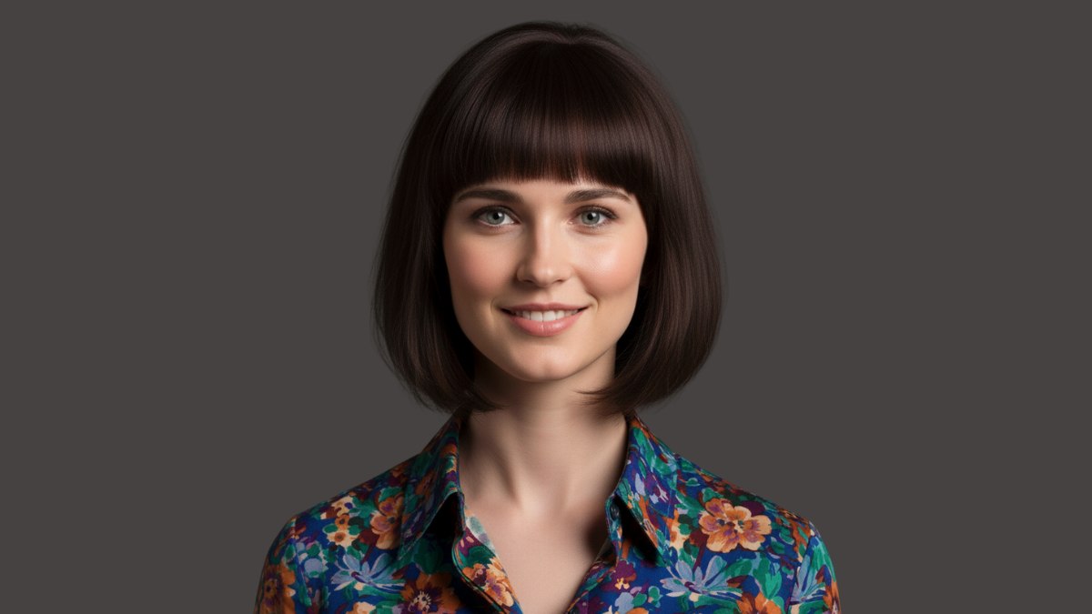 De bloemenblouse laat het geheel echt tot leven komen. De levendige, meerkleurige bloemenprint in blauw, oranje, groen en paarstinten vormt een prachtig contrast met de strakke bob. Het voegt persoonlijkheid, creativiteit en een speelse spirit toe aan de look. De kraag sluit mooi aan in de nek, waarbij hij de cleane lijnen van de bob benadrukt, terwijl het gedurfde patroon ervoor zorgt dat de look fris en modebewust blijft in plaats van klassiek of conservatief.