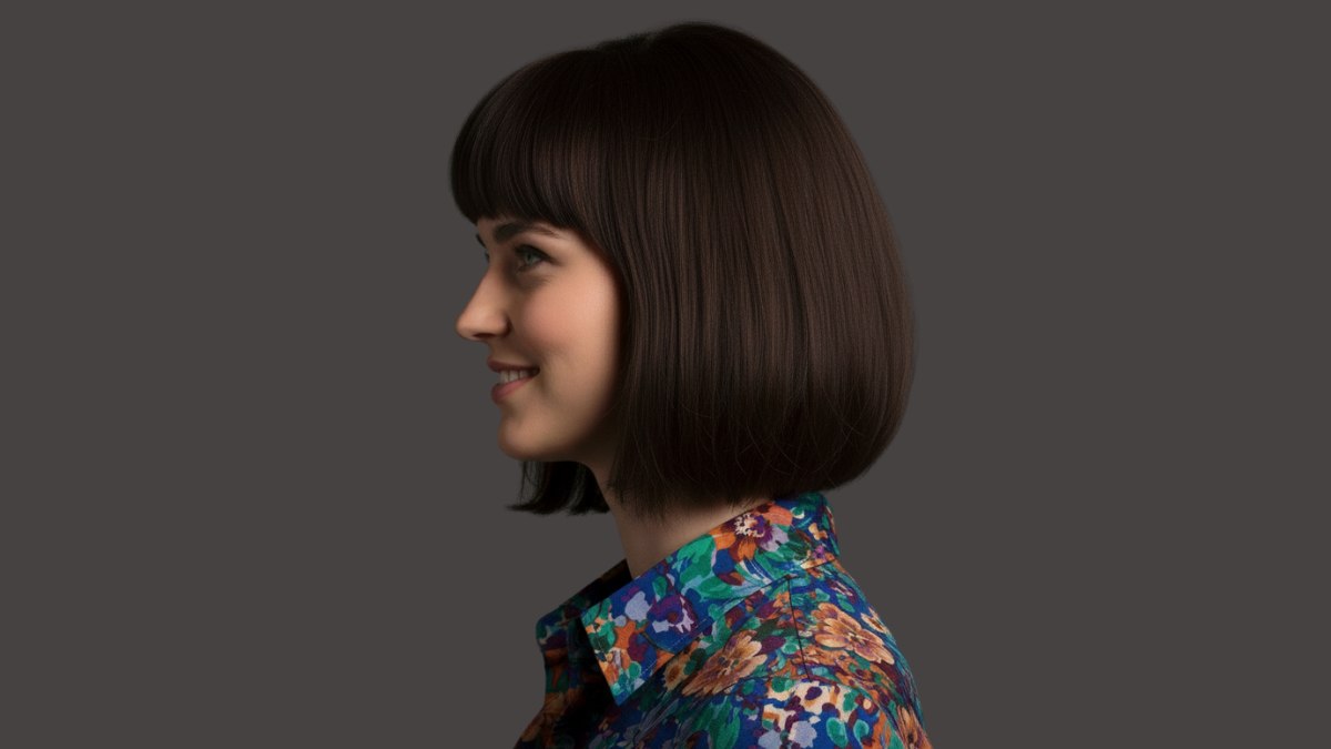 De styling is glad en beheerst. Elke haarlok is zorgvuldig geföhnd om een glanzende finish te creëren die het licht vangt en weerkaatst. Het haar ligt dicht tegen het hoofd bij de kruin en buigt lichtjes naar binnen aan de punten, waardoor een zachte curve ontstaat. Het is zo’n kapsel dat eenvoudig lijkt, maar vakmanschap vereist om perfect uit te voeren.
