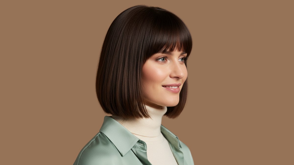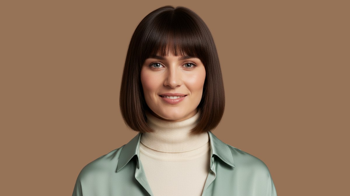 Dit is een toonbeeld van precisiewerk: een perfect uitgevoerde, kaarsrechte bob die net onder de kaaklijn valt. De kniplijn is onberispelijk recht aan de achterkant, waardoor een geometrisch silhouet ontstaat dat nooit uit de mode raakt. Wat deze bob onderscheidt, is de recht geknipte pony die de wenkbrauwen raakt en zo een verfijnd kader om het gezicht vormt.