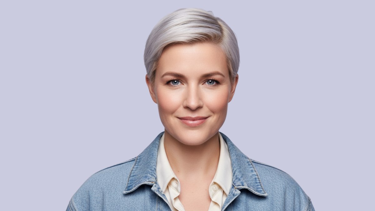 De lichte kleur van het jasje vult bovendien de koele tinten van het haar mooi aan, terwijl de klassieke kraag de strakke lijnen van het kapsel weerspiegelt. Deze combinatie zegt: “Ik ben stijlvol maar benaderbaar, modebewust maar niet overdreven.”