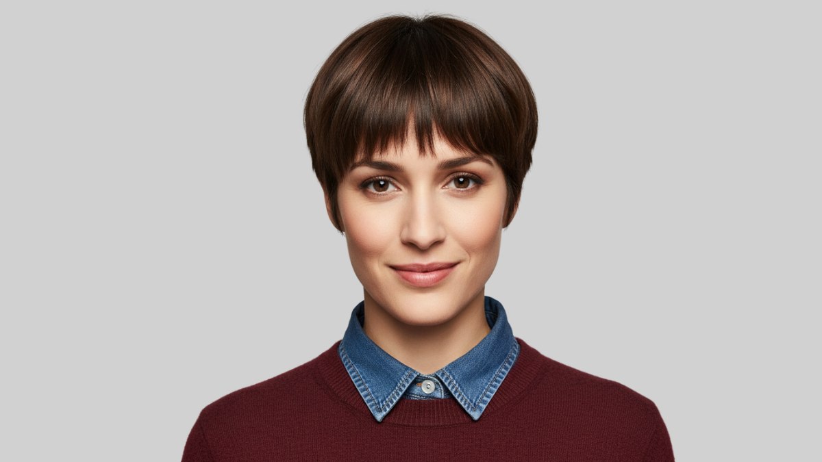De bordeauxrode trui gecombineerd met het denim hemd vormt een perfecte aanvulling op dit korte kapsel. Het contrast tussen het casual denim en het verfijnde breiwerk weerspiegelt de balans die de coupe zelf ook toepast: benaderbaar én elegant. Tegelijkertijd versterkt de rijke wijntint de warmte in de bruine haarkleur.