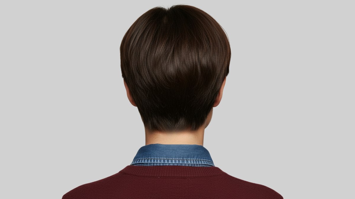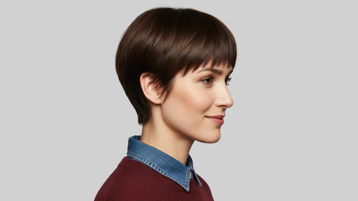 Deze korte haarsnit is moderne minimalisme met een verfijnde rand. Het haar is in lagen geknipt om overal dimensie te creëren, met kortere lengtes in de nek die geleidelijk overgaan in iets langere stukken bij de kruin. De zijkanten zijn netjes en dicht tegen het hoofd gehouden, waardoor de natuurlijke elegantie van de gezichtsvorm goed uitkomt.