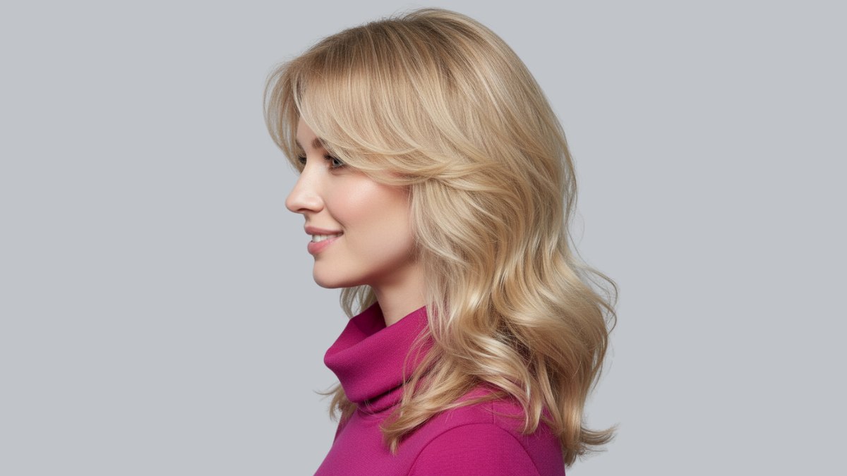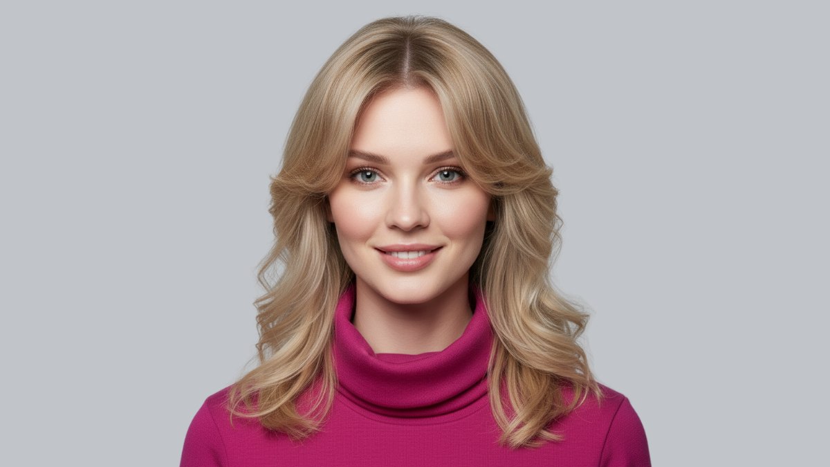 De magenta coltrui is een gedurfde keuze bij dit kapsel. De kleur vormt een prachtig contrast met het warme blonde haar, waardoor zowel de tint als de styling extra opvallen. De hoge halslijn benadrukt de lagen rond het gezicht en trekt de aandacht naar boven, naar de beweging en glans van het haar.