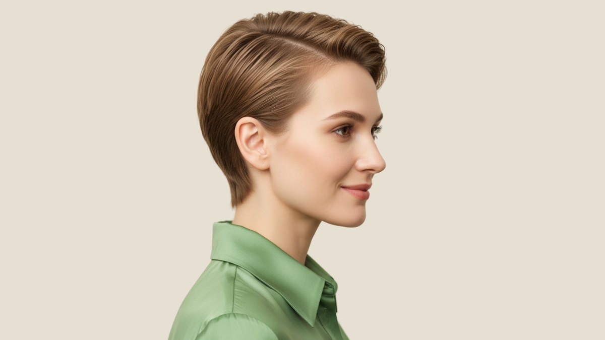 Deze snit laat zien dat kort haar net zo veelzijdig en vrouwelijk kan zijn als langere kapsels. De coupe heeft kort geknipte zijkanten en nekpartij, met aanzienlijk meer lengte bovenop voor een modern contrast.