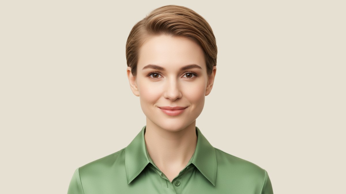 Het groene zijden hemd met klassieke kraag is een uitstekende keuze bij dit kort kopje. Kort haar legt de nek en schouders bloot, en de gestructureerde kraag omlijst dit gebied op een manier die het kapsel versterkt zonder ermee te concurreren. De gladde stof en strakke lijnen passen perfect bij de verfijnde uitstraling van de coupe.