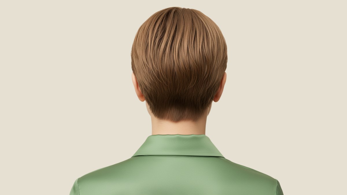 De haarkleur is koel lichtbruin met subtiele, dimensionale highlights. Deze lichtere stukjes vangen het licht en geven beweging, zodat het korte kapsel niet streng of vlak oogt. De asbruine ondertoon is eigentijds en past mooi bij de gestructureerde vorm van het kapsel.