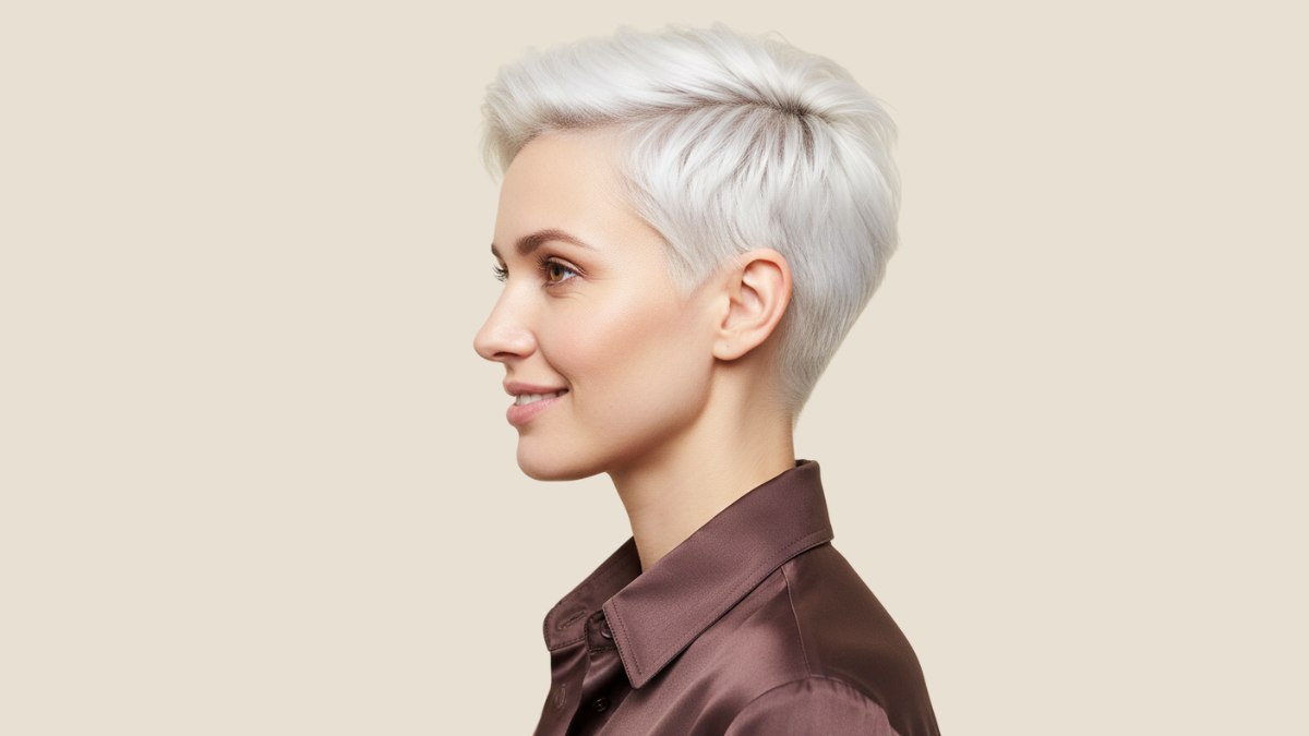 Deze ultrakorte pixie is een gedurfde, modebewuste coupe. De zijkanten en achterkant zijn zeer kort geknipt, bijna op tondeuselengte, terwijl de bovenkant iets langer blijft voor textuur en styling.