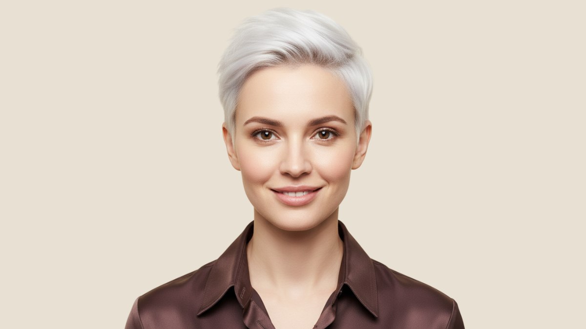 Het chocoladebruine zijden hemd vormt een mooi contrast met het ijzig blonde haar. De warme, diepe kleur van het hemd laat de koele haartoon nog helderder uitkomen. De klassieke kraag werkt prachtig met een ultrakorte coupe, omdat hij structuur biedt en het gezicht omlijst, terwijl de zachte, glanzende stof de edgy uitstraling van het kapsel in balans brengt.