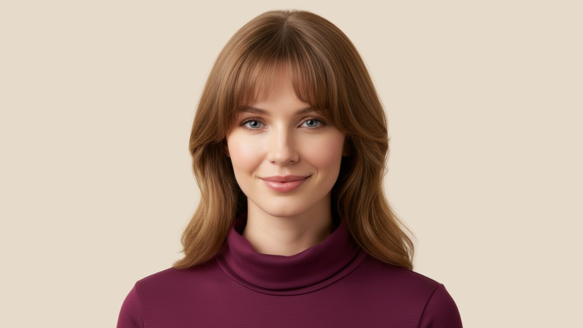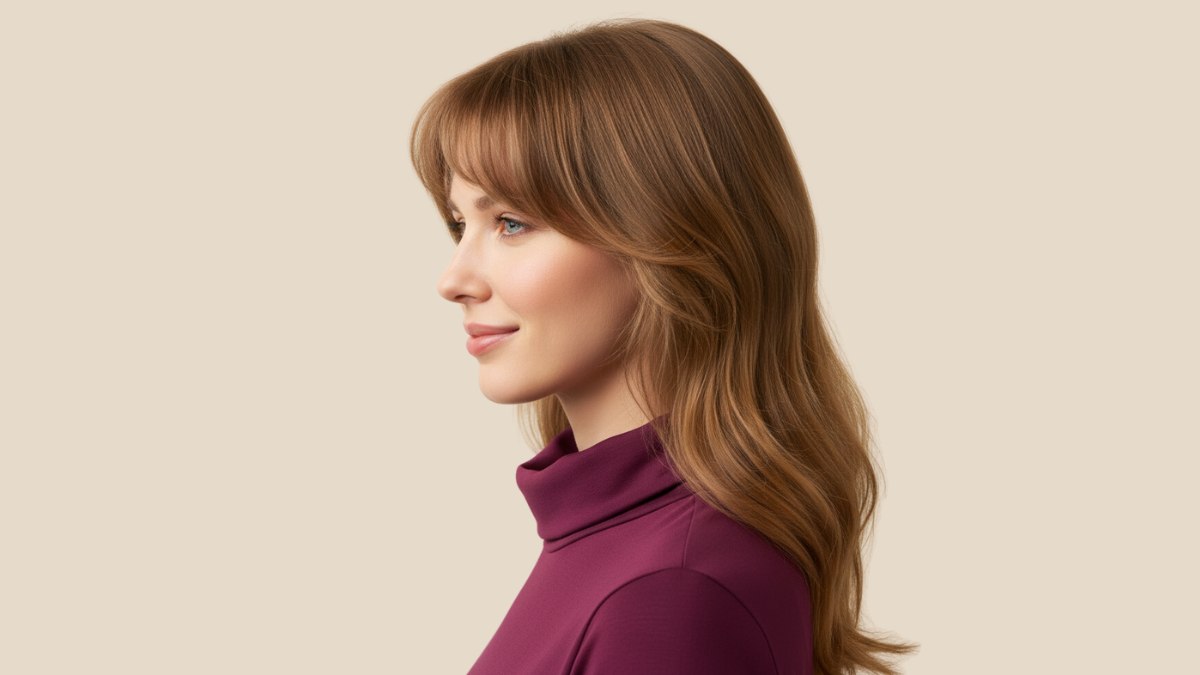 De pruimkleurige coltrui vormt een perfecte aanvulling op dit kapsel. De diepe, effen kleur biedt een ideale achtergrond waardoor de warme haartinten extra opvallen, terwijl de hoge kraag een mooi contrast vormt met de vloeiende golven. De eenvoud van de coltrui sluit aan bij de nette maar natuurlijke uitstraling van het kapsel zelf.