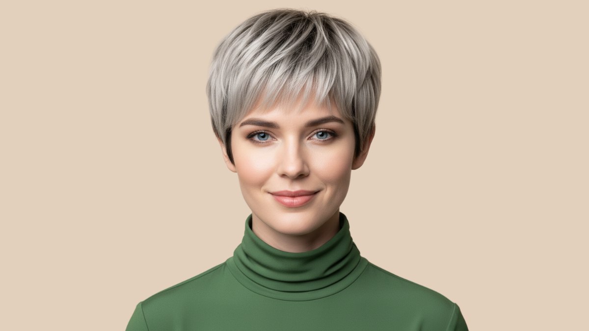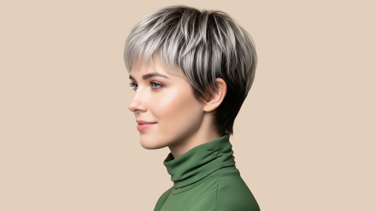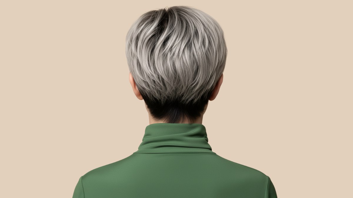 Wat deze look bijzonder maakt, is de schitterende zilvergrijze haarkleur. Dit is geen doorsnee grijs, maar een modieuze, eigentijdse tint. De kleur lijkt een koele zilvertint in een all-over toepassing, met subtiele variaties in diepte die een peper-en-zout¬effect geven voor extra dimensie. Donkerdere houtskooltonen komen door bij de aanzet en in de kortere gedeelten in de nek, wat contrast biedt en voorkomt dat het zilver vlak of eentonig lijkt.