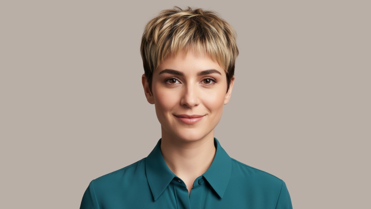 De blouse past perfect bij dit warm getinte kapsel. De koele blauwgroene kleur vormt een prachtig contrast met de gouden en honingkleurige nuances in het haar, waardoor de combinatie harmonieus en toch dynamisch aanvoelt. De kraag voegt een nette touch toe die mooi samengaat met de casual textuur van het kapsel, waardoor het geheel ideaal is voor iemand die er stijlvol uit wil zien zonder er te opgeprikt uit te zien.