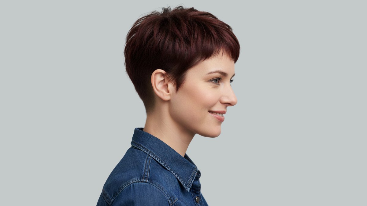 De keuze voor een klassieke denim blouse past perfect bij dit kort kapsel. Het casual maar tijdloze karakter van denim vult de moderne, strakke lijnen van de pixie aan zonder om aandacht te concurreren. De kraag van de blouse weerspiegelt de precisie van het kapsel, terwijl de denimstof de look draagbaar houdt voor elke dag.