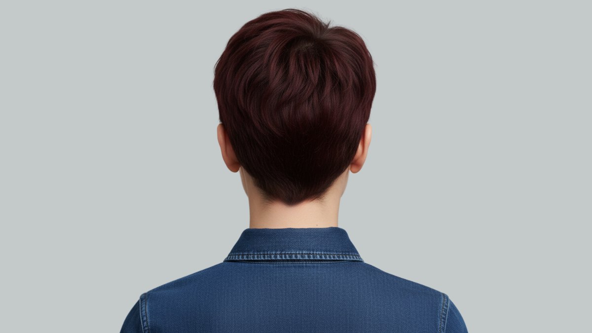 De haarkleur is donker chocoladebruin met hints van bordeaux die het licht opvangen en diepte en dimensie aan de coupe toevoegen. Deze diepere tint creëert een krachtig contrast met een lichte huid en laat de ogen duidelijker naar voren komen.