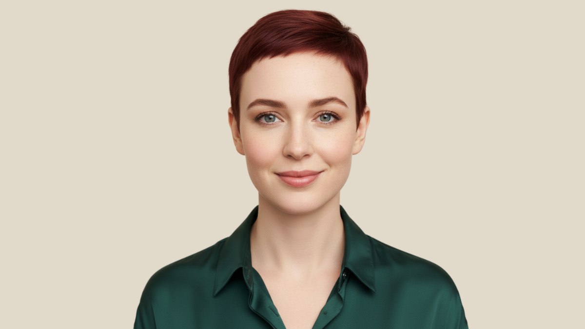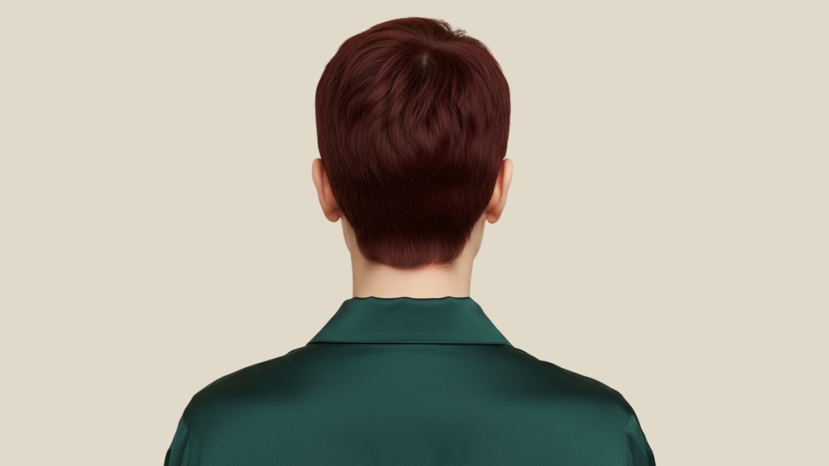 De haarkleur is een diepe, koelgetinte mahoniebruine tint die tegen chocoladebruin aanleunt, met subtiele rode ondertonen die in bepaald licht zichtbaar worden. Deze verfijnde tint geeft diepte aan de coupe en benadrukt de precisie van de kniplijnen. De donkere kleur zorgt bovendien voor een krachtige uitstraling.
