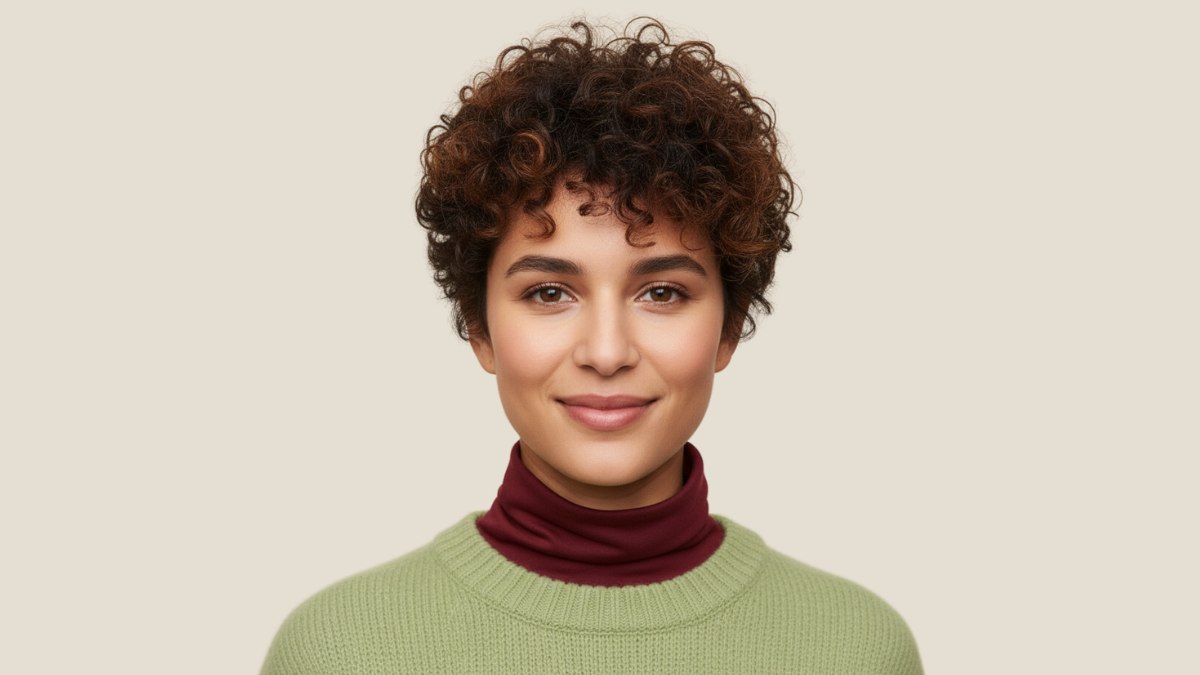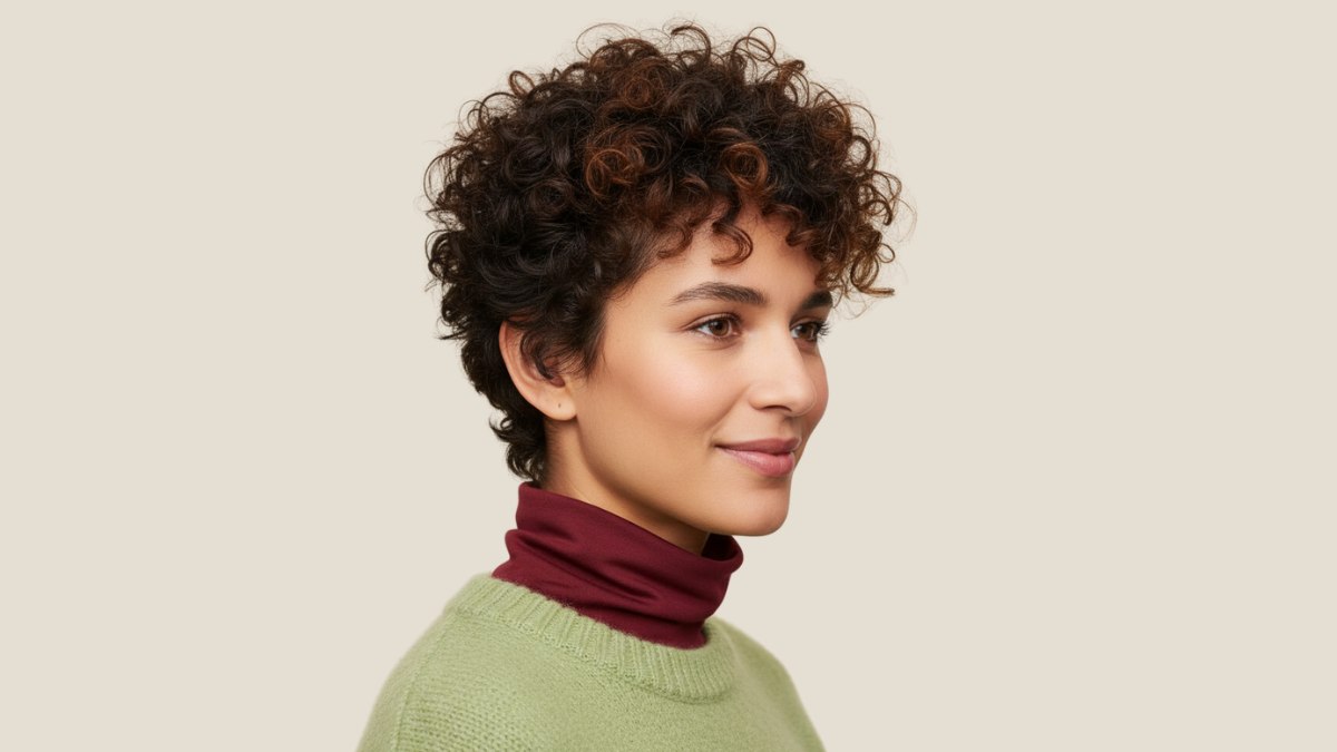 Dit korte krullenkapsel is perfect geknipt voor iedereen die met zelfvertrouwen haar natuurlijke haartextuur wil omarmen. De snit begint laag in de nek en bouwt geleidelijk volume op naar de kruin en zijkanten, waardoor een prachtig afgeronde vorm ontstaat.