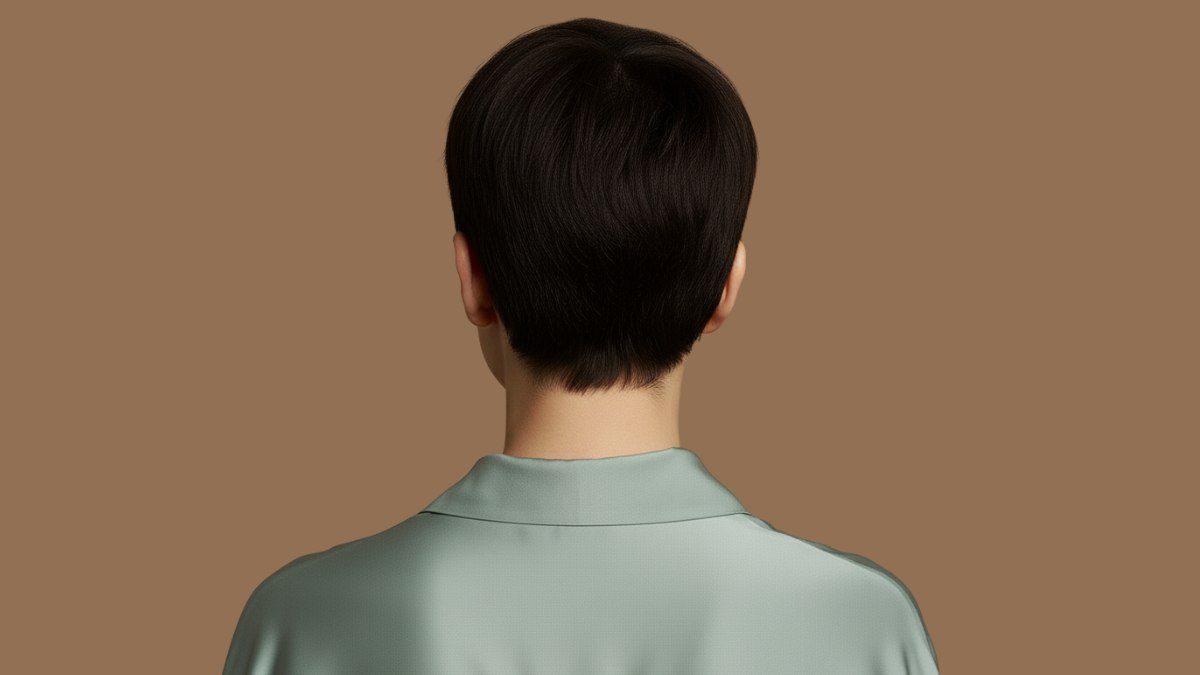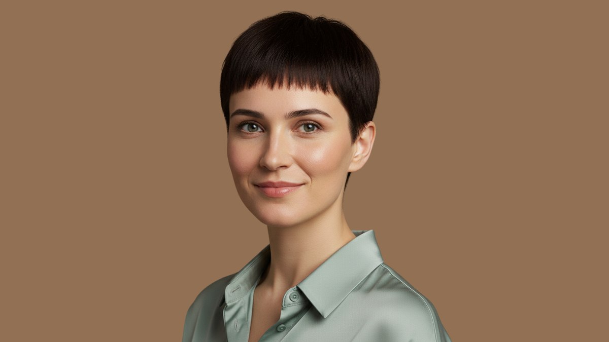 De korte pony is het opvallende kenmerk van deze coupe. Hij is recht en bot geknipt, hoog boven de wenkbrauwen, op een manier die zowel retro als modern aanvoelt. Deze pony creëert een horizontale lijn die de aandacht naar de ogen trekt en een sterk grafisch element toevoegt. Hij is precies geknipt, maar heeft net genoeg zachtheid om niet te streng te lijken.