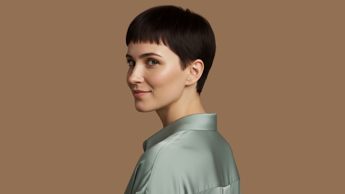 Deze ultrakorte pixie straalt zelfvertrouwen en een moderne edge uit. Het haar is zeer kort geknipt aan de zijkanten en achterkant, wat een strakke vorm creëert die de botstructuur van gezicht en nek benadrukt.