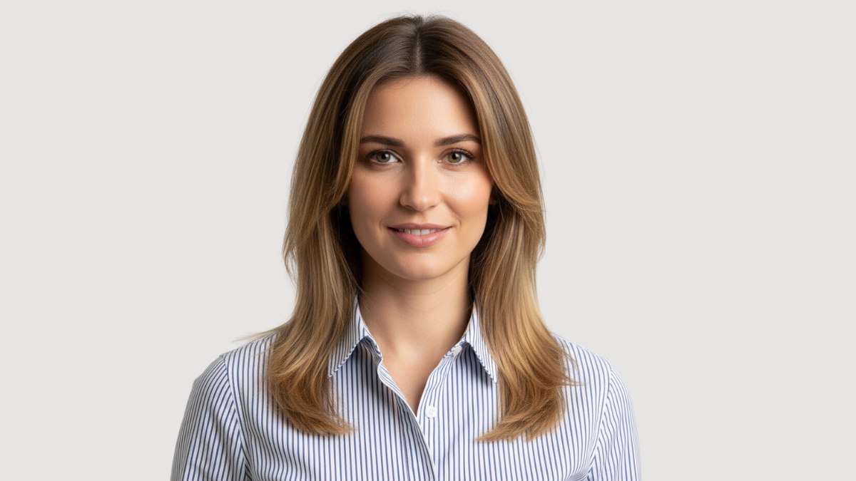 Het blauw-wit gestreepte overhemd vormt een prachtig contrast met de warme blonde tinten. Het frisse, klassieke patroon geeft een vleugje professionaliteit die perfect past bij het verfijnde, goed verzorgde haar, terwijl het koele blauw de gouden warmte van het blond nog stralender maakt.