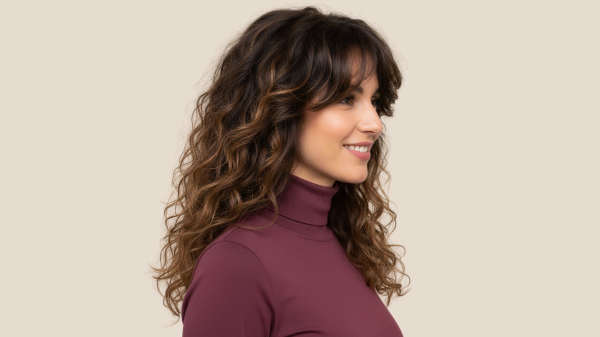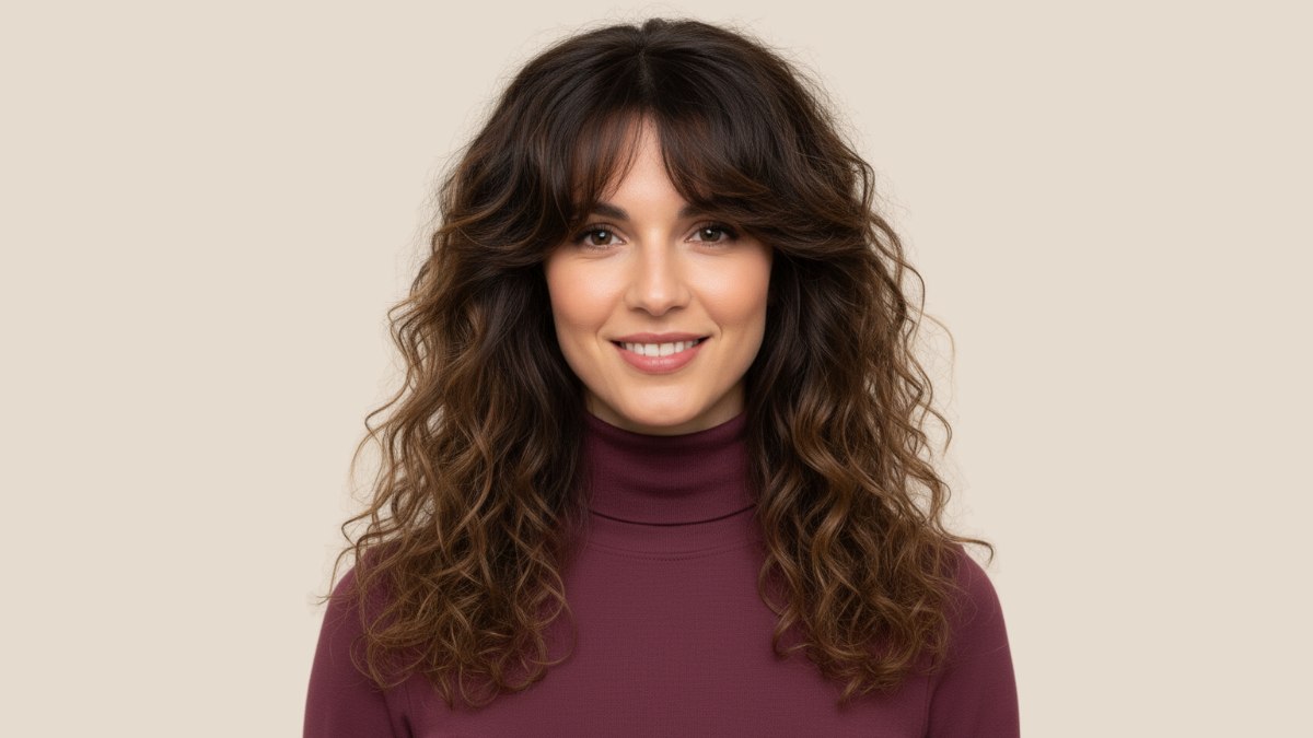 De curtain bangs (gordijnpony) vormen de perfecte finishing touch, zachtjes naar beide kanten van het voorhoofd geveegd en naadloos overlopend in de omliggende lagen. Ze zijn geknipt om perfect samen te werken met het natuurlijke krulpatroon en vallen in zachte, gezicht omlijstende slierten die een romantische sfeer creëren.