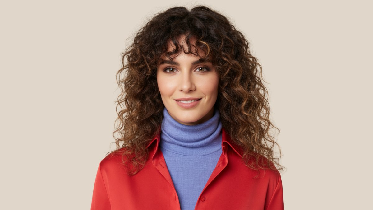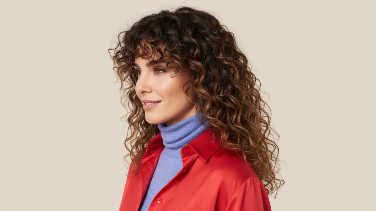 De pony is een echte eyecatcher: krullend, getextureerd en nonchalant over het voorhoofd vallend. Dit is geen strakke, rechte pony maar een zachte, speelse sluier van krullen die een romantische, licht bohemien sfeer toevoegt. De gezicht omlijstende lagen versterken dit gevoel, met lokken van uiteenlopende lengtes die rond de jukbeenderen en kaaklijn krullen.