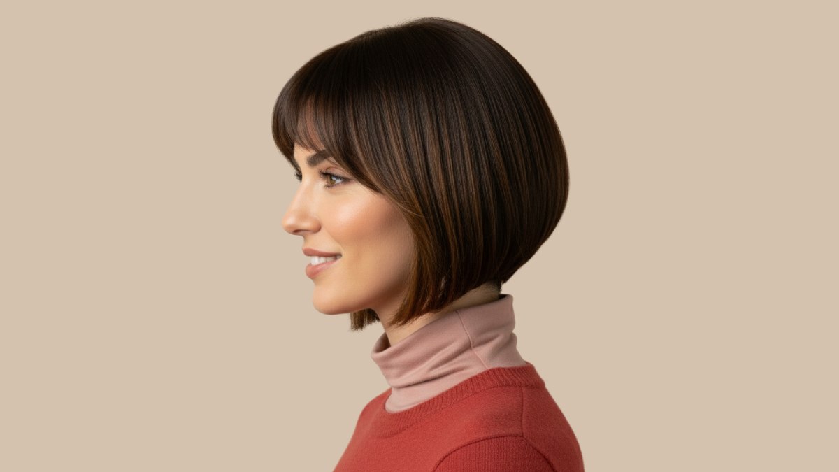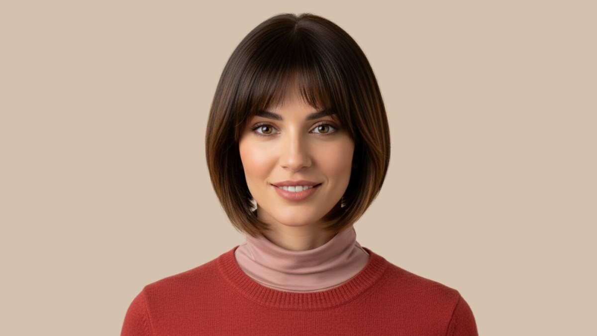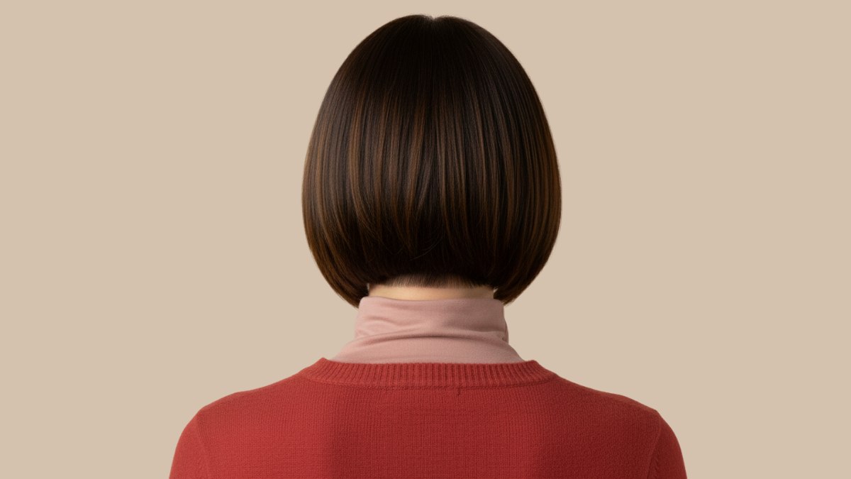 Deze ronde, schuine bob met een kortere achterkant is een toonbeeld van precisie knipwerk en ingetogen elegantie. Het haar valt net onder de kaaklijn in een coupe die zacht naar binnen krult, waardoor een ronde vorm ontstaat die vrijwel elke gezichtsvorm flatteert.