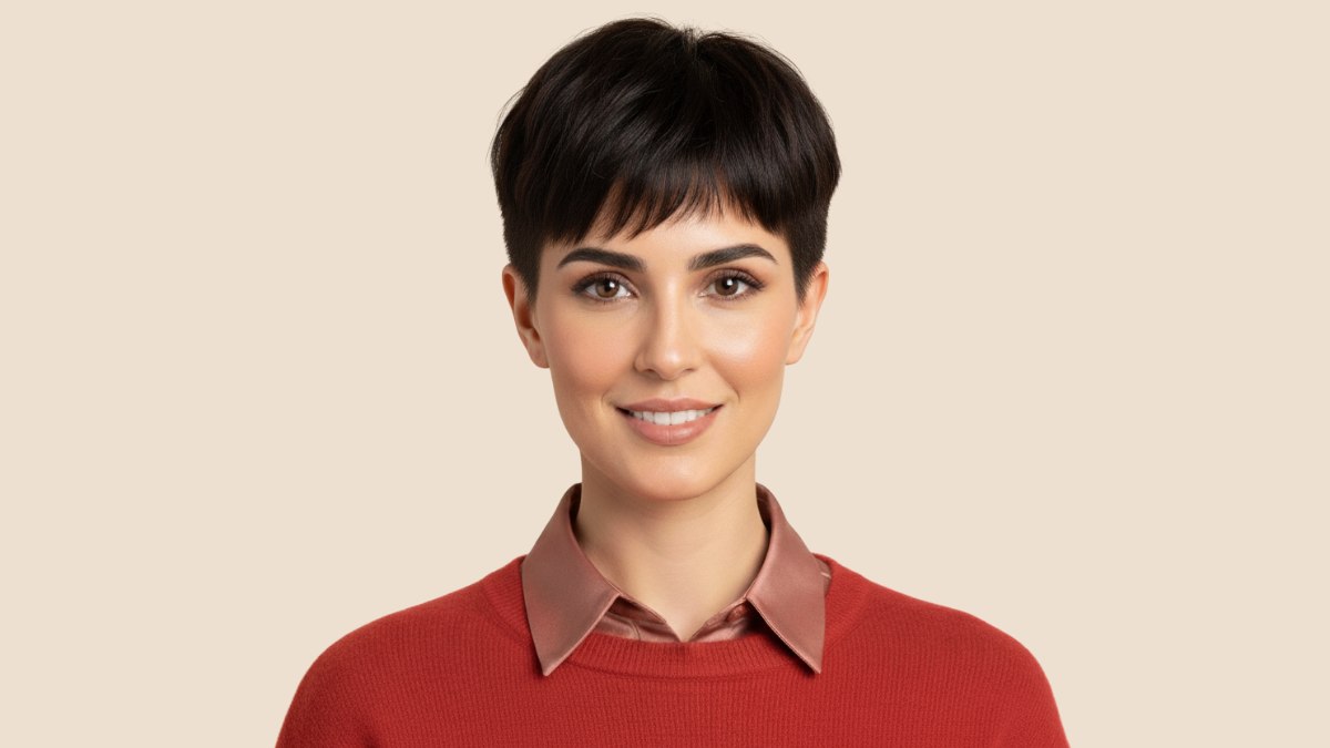 De styling toont de natuurlijke textuur van de coupe, met licht warrige lokken alsof ze met de vingers en een beetje texturizer zijn gevormd. Dit voorkomt dat het korte kapsel te strak of té gestyled oogt.