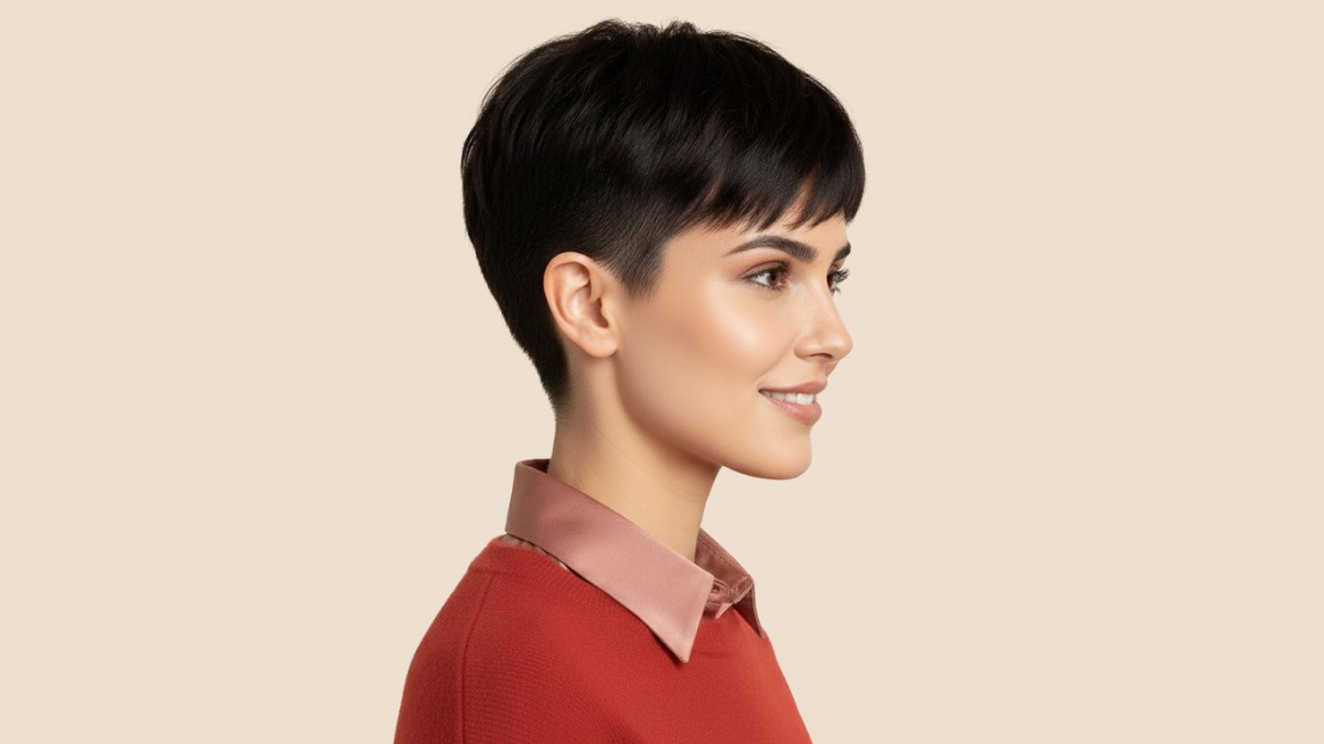 Deze gedurfde, korte coupe is een ode aan textuur, beweging en onverschrokken stijl. Het haar is in meerdere korte lagen geknipt, wat dimensie en lift creëert, met langere lengtes bovenop die naar voren of opzij kunnen worden gestyled.