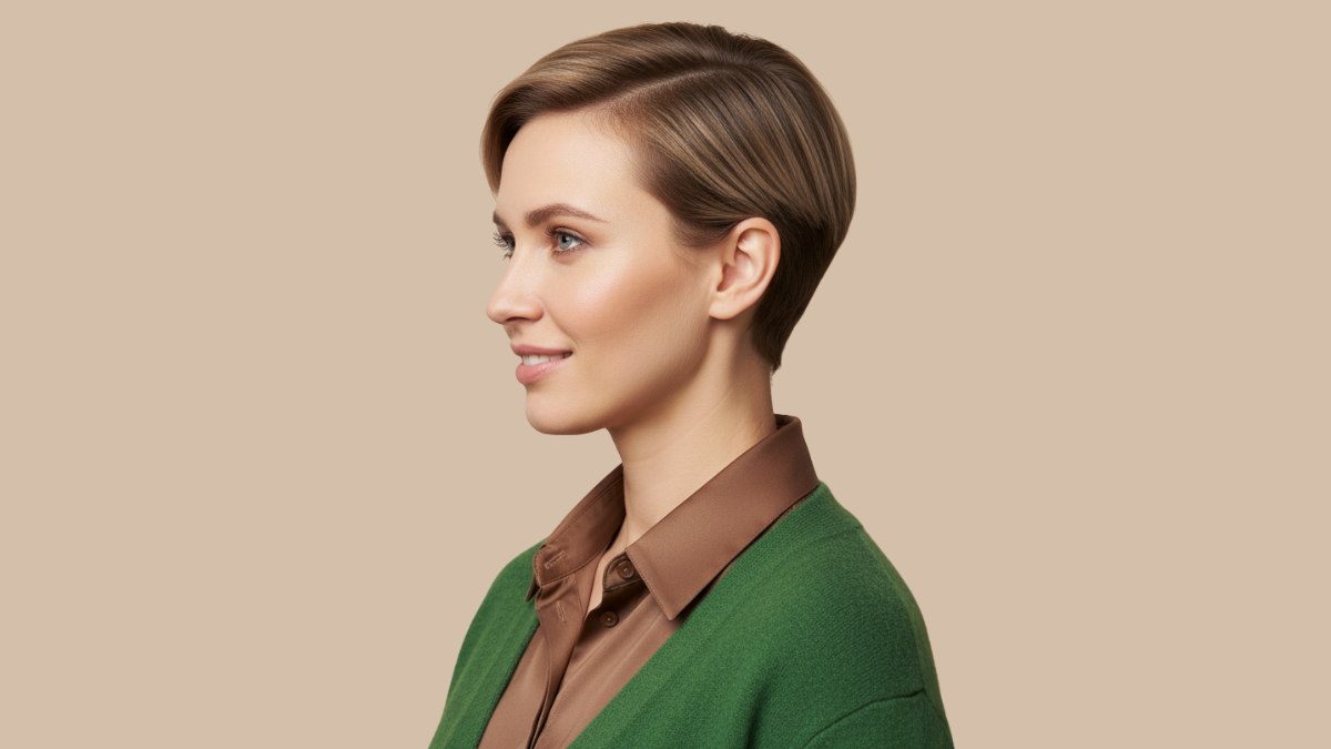 De styling benadrukt de elegante eenvoud van de snit, met het haar soepel naar achteren en opzij gestyled, maar met genoeg textuur om natuurlijk en moeiteloos te blijven. Een subtiele golf en lichte ronding geven extra zachtheid en vrouwelijkheid.