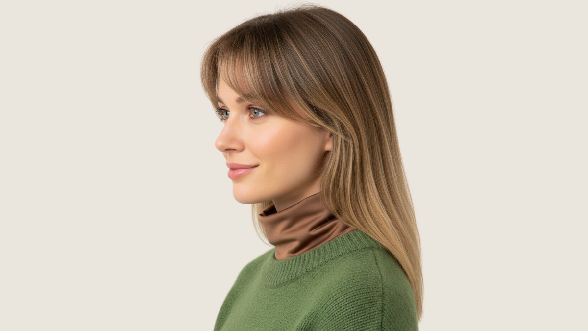 De structuur van de gebreide stof geeft visueel gewicht aan het onderste deel van de look, wat een fijne balans vormt met het vloeiende, lichtere haar erboven. De bruine zijden coltrui die onder de trui zichtbaar is, voegt een luxueus accent toe dat prachtig aansluit bij de rijke, donkere haarwortels.