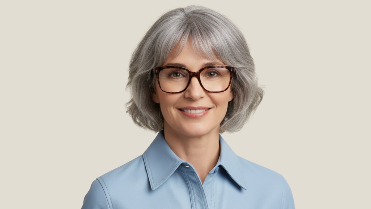 Het blauwe leren hemd sluit prachtig aan bij de zilverachtige tinten in het haar. Het koele kleurenpalet voelt samenhangend en verfijnd aan, terwijl de strakke kraag zorgt voor een vleugje structuur die de zachtheid en beweging van de golvende bob mooi in balans brengt. Het is een combinatie die elegantie fluistert in plaats van schreeuwt.