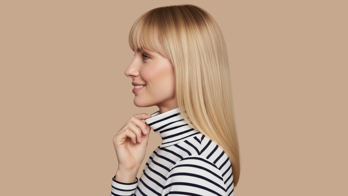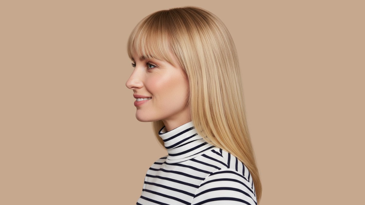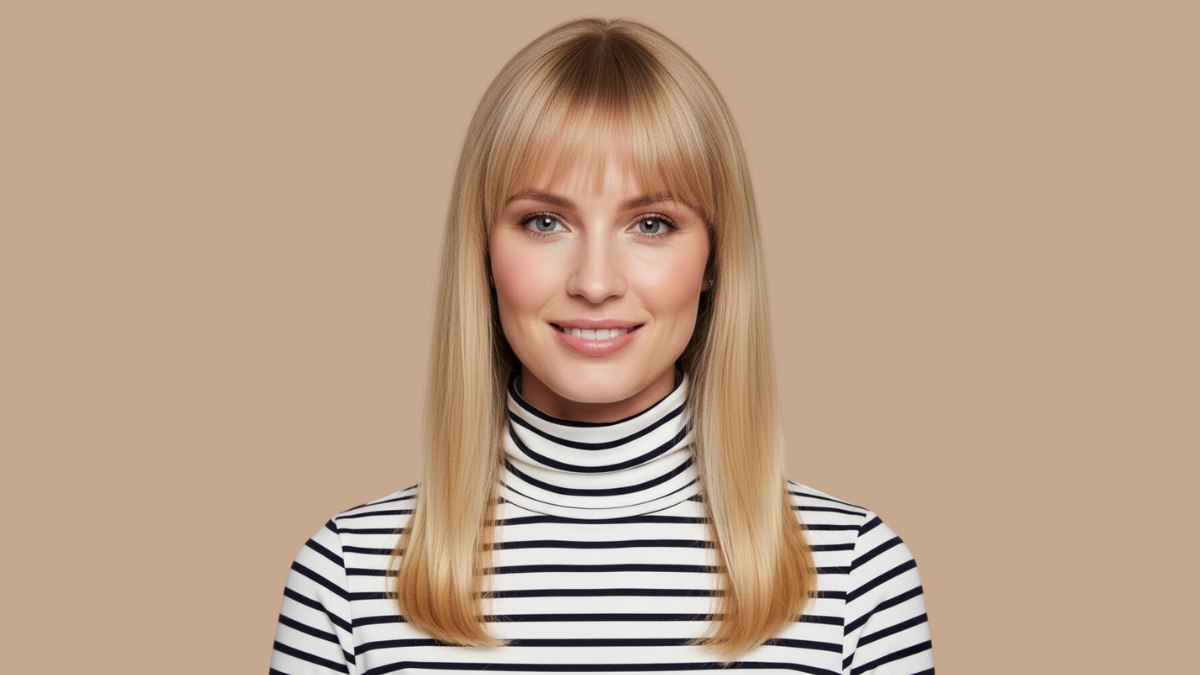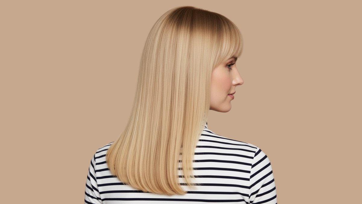Dit kapsel viert de schoonheid van glad, verzorgd, lang haar met strategische laagjes en een klassieke pony die nooit uit de mode raakt. De snit bestaat uit lange, vloeiende lengtes die ruim voorbij de schouders vallen, met subtiele interne laagjes die voorkomen dat het haar zwaar oogt, terwijl de volheid behouden blijft.