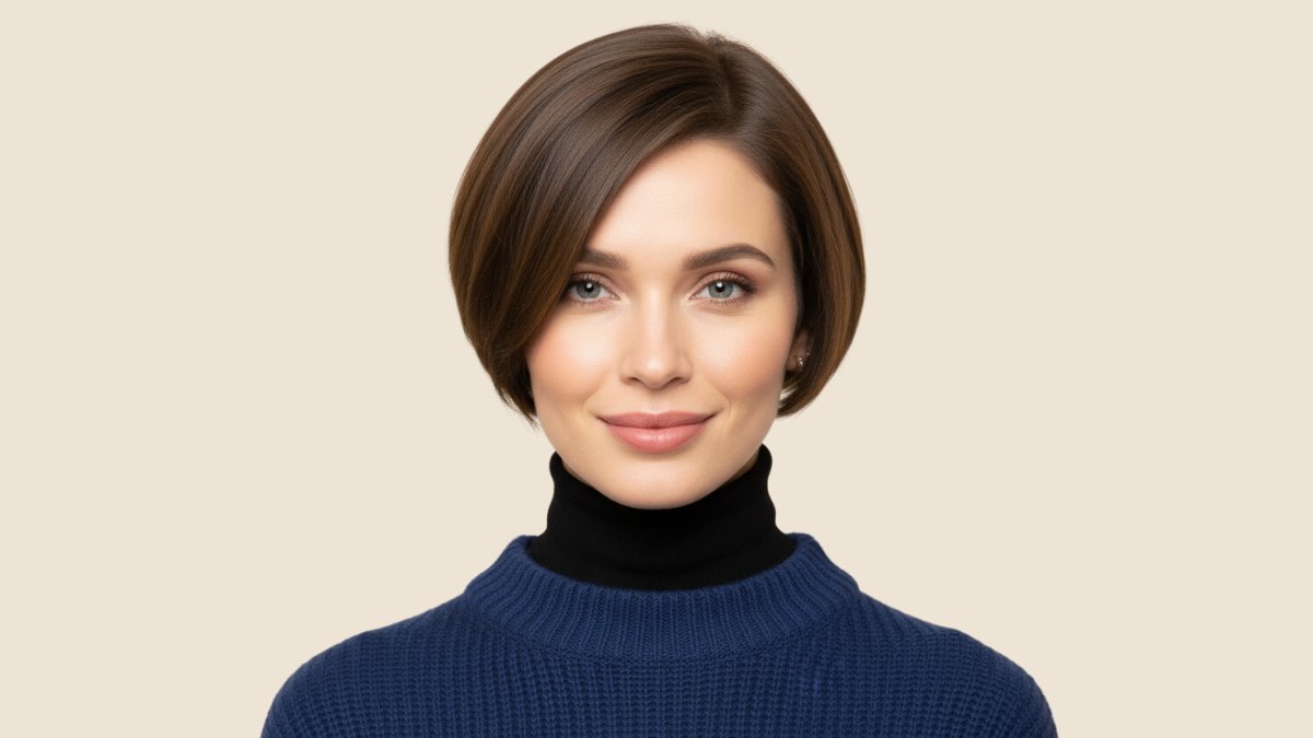 De blauwe trui versterkt de verfijnde uitstraling van dit kapsel. De gestructureerde brei en de krachtige kleur creëren een gevoel van elegantie dat perfect aansluit bij de precisie van de snit. Het contrast tussen de zwarte col en de blauwe trui vormt een ideale aanvulling op de strakke, hoekige lijnen van deze bob. Dit is een look voor een zelfverzekerde, moderne vrouw.
