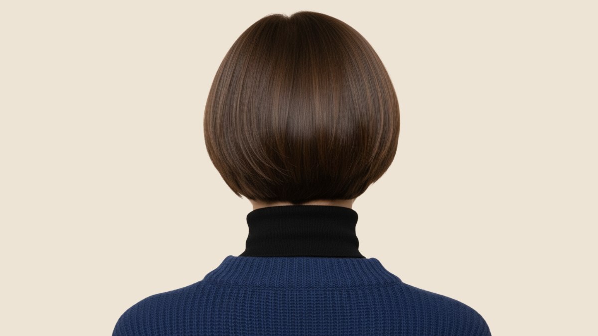 De haarkleur is een diepe chocoladebruine tint die gelijkmatig is aangebracht, met een hoge glans die het licht prachtig reflecteert. Deze monochrome aanpak houdt de aandacht volledig op de mooie lijnen van het kapsel zelf. Dit is haar dat tot in de puntjes glad is gemaakt, waarbij elke lok op zijn plaats ligt.
