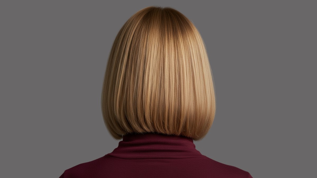 De bordeauxrode coltrui tilt dit kapsel van klassiek naar uitzonderlijk. De diepe wijnkleurige stof vormt een luxueuze achtergrond die de honingblonde tinten van het haar laat oplichten. De col creëert een strakke lijn die de geometrische precisie van de bob versterkt, terwijl de rijke kleur extra diepte en warmte toevoegt aan de totale uitstraling.