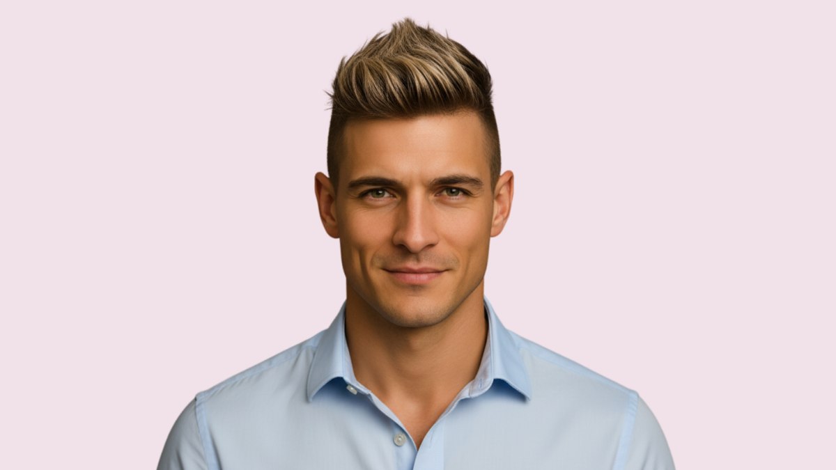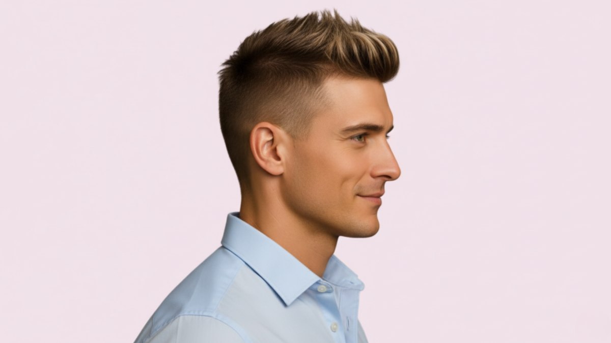 De schoonheid van dit herenkapsel zit in de strakke lijnen en de manier waarop het je gezicht omlijst. Het omhoog gestylede bovenhaar trekt de aandacht naar boven, terwijl de korte zijkanten het geheel netjes houden. Stoer maar niet agressief, stijlvol zonder moeite.