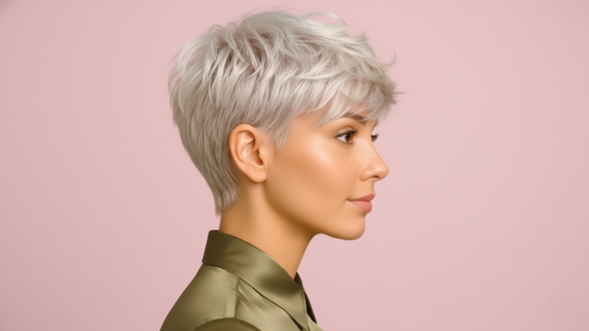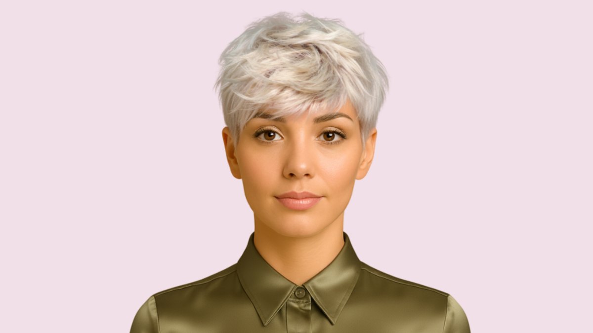 Die platinakleur tilt dit korte kapsel naar een heel ander niveau. De lichte, zilverachtige tinten vangen elke nuance van de gelaagde snit, accentueren de textuur en laten elke pluk opvallen terwijl het geheel toch samenhangt. Het kleuren vergt vakmanschap en geduld: meerdere bleek¬beurten gevolgd door zorgvuldig tonen om die koele, asblonde finish te bereiken.