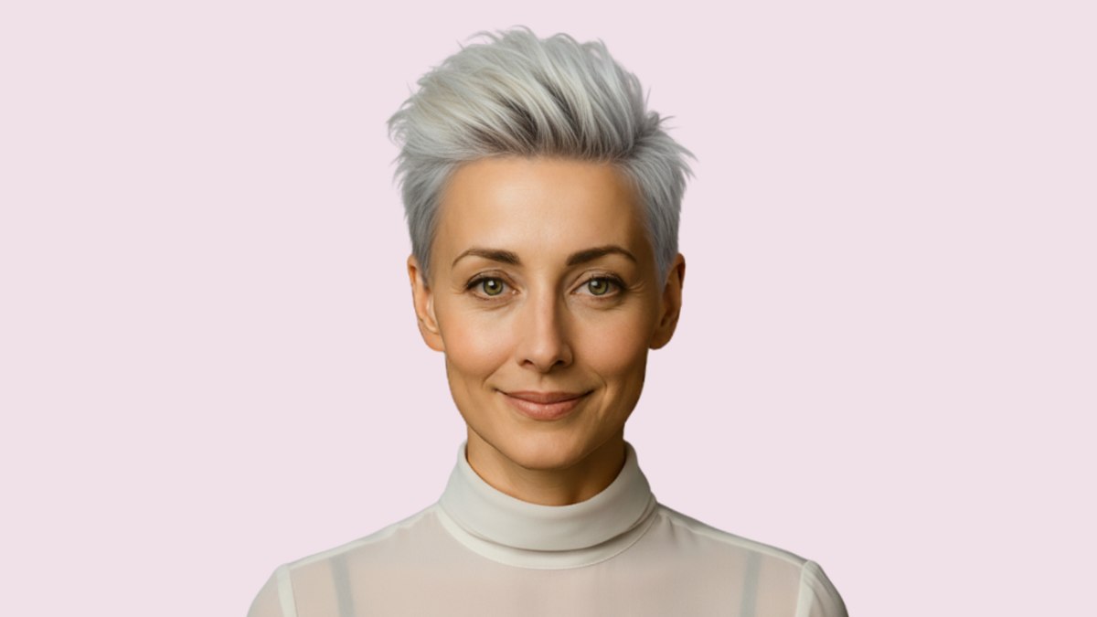 De coupe zelf is een meesterwerk in hoe je kort haar vrouwelijk en chic laat lijken. Iets langer dan een klassieke pixie, met laagjes die volume en beweging toevoegen. De styling zorgt voor een mooie textuur die het licht vangt en visueel interessant blijft. Stijlvol genoeg voor een professionele omgeving, maar met voldoende persoonlijkheid voor een frisse, moderne uitstraling.