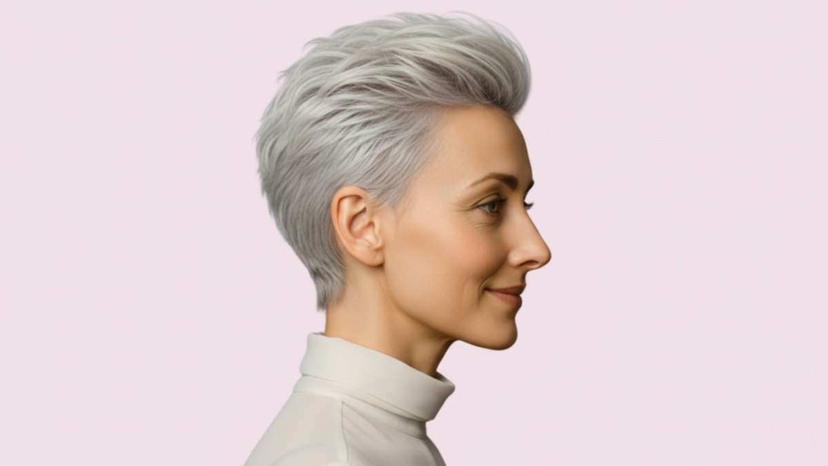 Wie zegt dat grijs worden betekent dat je stijl moet opgeven? Deze zilveren korte snit bewijst dat het omarmen van je natuurlijke kleurverandering een van de mooiste beslissingen ooit kan zijn. Het is geraffineerd, modern en oogverblindend, alsof je zelfvertrouwen draagt als accessoire.