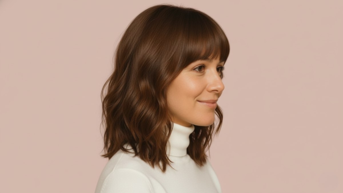 Zachte, natuurlijke golven die losjes tot aan de schouders reiken, zorgen voor een subtiele tegenhanger van de strakke pony. Deze golven geven het haar een "ingeleefde" textuur, wat beweging en diepte toevoegt. In plaats van strakke krullen, hebben deze golven een nonchalant en ontspannen karakter, wat het kapsel een luchtige, moeiteloze uitstraling geeft die perfect is voor elke gelegenheid. De schouderlange snit omlijst het gezicht en verlengt optisch de nek, wat het silhouet versterkt en een flatterend effect creëert.