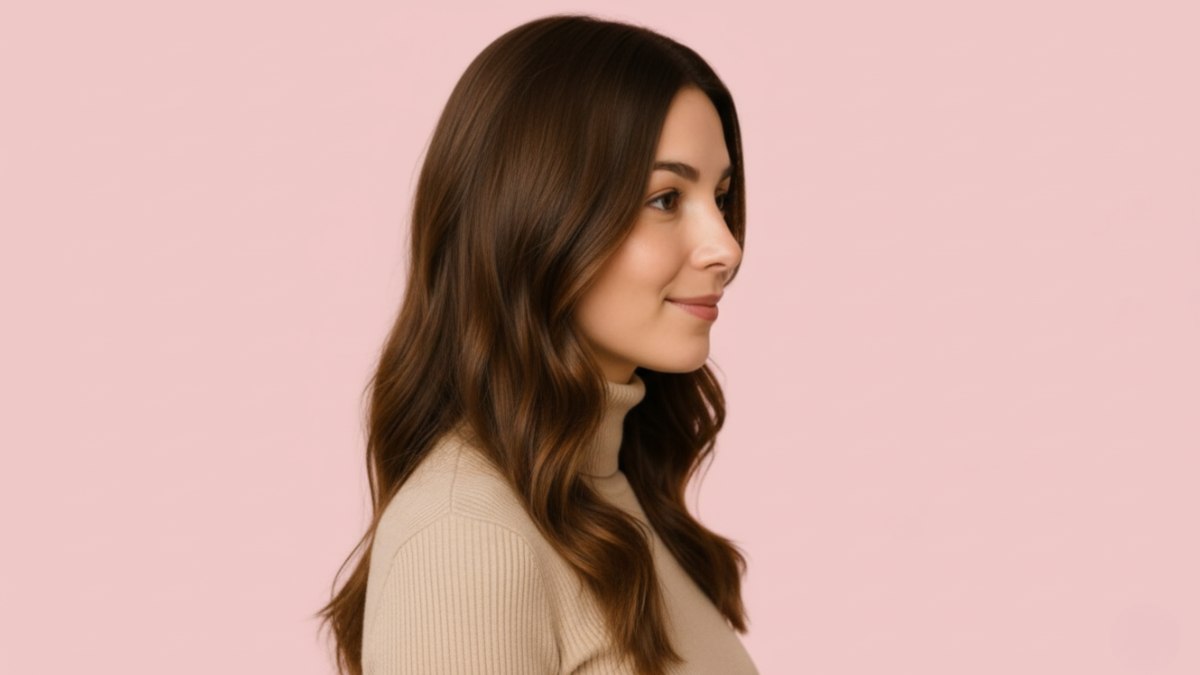 Evenzeer opvallend is de rijke, bruine tint van deze haarstijl. De basis is een diep, warm bruin, verfraaid met subtiele highlights die door de middellange lengtes en uiteinden lopen. Deze lichtere tonen, vooral rond het gezicht, creëren een zongebleekt effect dat de golvende textuur prachtig aanvult. De geleidelijke, natuurlijk uitziende kleurovergang—vaak bereikt met balayage of zachte highlights—voegt dimensie en diepte toe zonder overdreven te zijn, resulterend in een harmonieuze uitstraling.