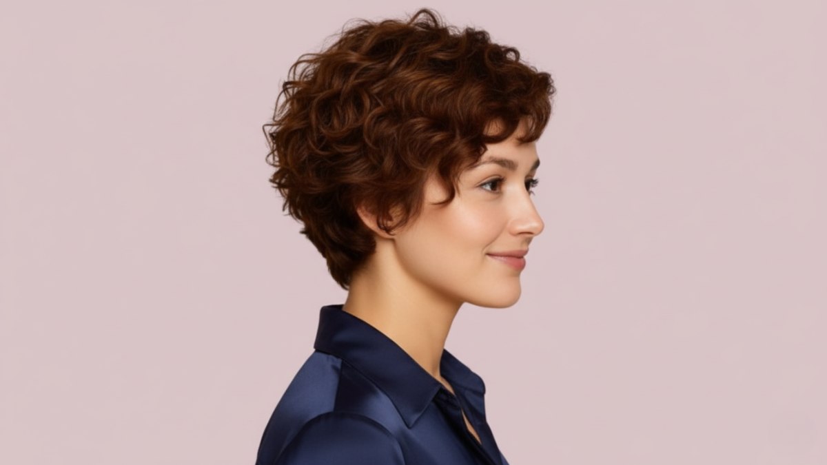 Betreed de fascinerende wereld van haarstyling met deze levendige krullende coupe, een moderne en frisse mix van een pixie en een klassieke bob. Stel je een kapsel voor dat perfect balanceert tussen lengte en speelse krullen, die samen een dynamisch silhouet vormen dat het gezicht prachtig omlijst. Het geheel straalt een jeugdige en gedurfde energie uit, terwijl het net boven de nek eindigt en de oren zachtjes raakt, wat het zowel gedurfd als flatterend maakt.