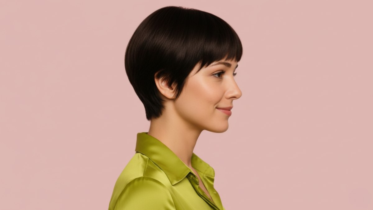 En laten we de pony niet vergeten! De rechte pony, die recht over het voorhoofd is geknipt, onderscheidt deze pixie cut echt. Hij zit net boven of raakt de wenkbrauwen en omlijst het gezicht op een gedurfde, dramatische manier. Het trekt de aandacht precies waar je die wilt – recht naar het gezicht – en geeft de hele look een verfijnde, maar gedurfde uitstraling. Deze pony is niet zomaar een bijzaak; het is een essentieel onderdeel van deze coole haarstijl.