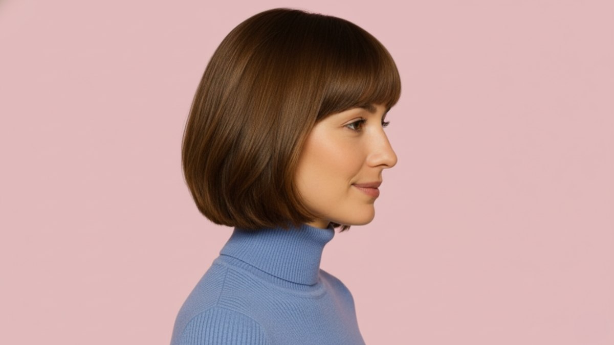 Deze bob tot aan de kin met zachte lagen en een volle, rechte pony is een tijdloos kapsel dat zowel fris als stijlvol oogt. De zachte kleur voegt een extra dimensie toe aan de look, waardoor het een modieuze en veelzijdige keuze is. Dit kapsel is perfect voor vrouwen die een comfortabele stijl willen met een vleugje persoonlijkheid.